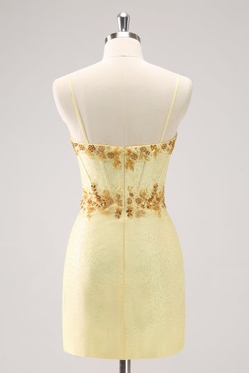 Sparkly Yellow Spaghetti Straps Corset Sequins Tight Mini Dress