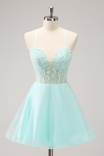 Sparkly Green A Line Corset Tulle Appliques Mini Dress