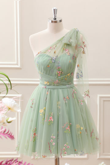 Cute Light Green A Line Tulle One Shoulder Floral Embroidery Mini Dress