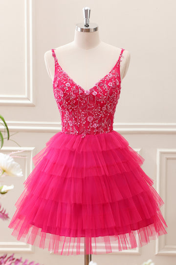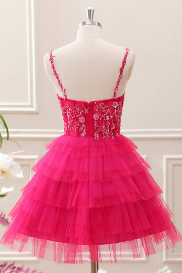 Fuchsia A Line Spaghetti Straps Corset Tiered Tulle Sequined Mini Dress