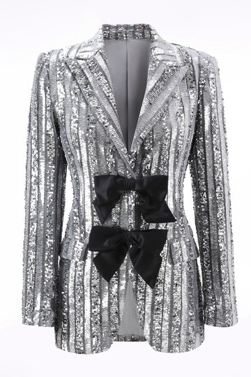 Silver Grey Sequin Peak Lapel Prom Blazer With Bows