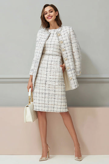 2-Piece Ivory Pencil Tweed Midi Work Dress