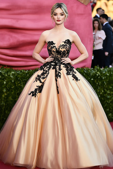 Champagne Ball Gown Satin Sweetheart Red Carpet Dress with Lace Appliques