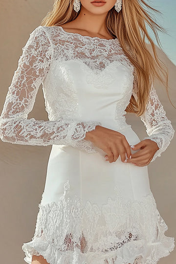 Elegant White A Line Boat Neck Lace Mini Dress with Long Sleeves