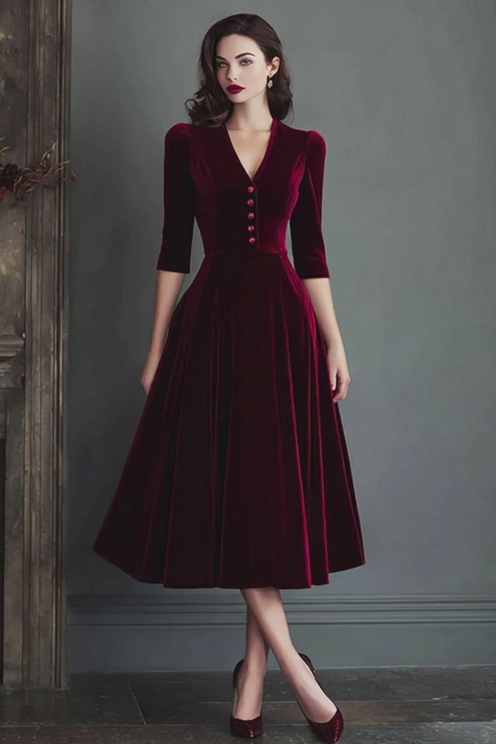 Burgundy Velvet A-Line V-Neck Midi Dress with Half Sleeves