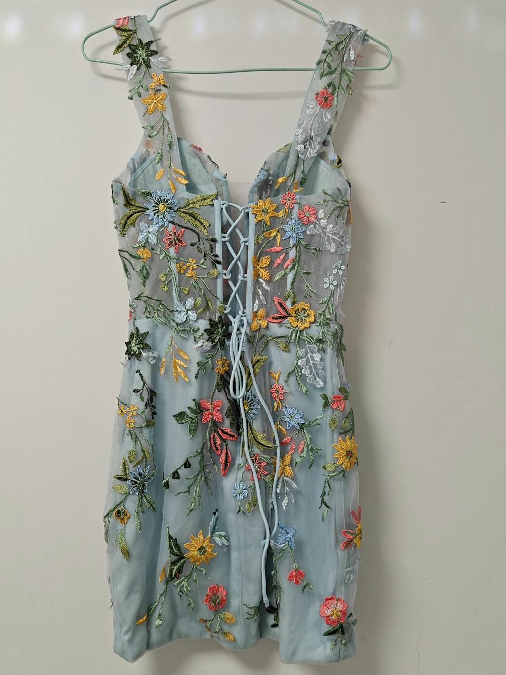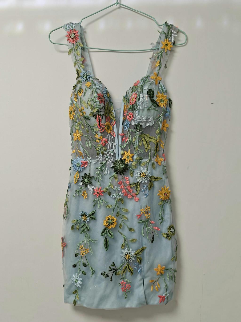Blue Flower Bodycon Spaghetti Straps Embroidered Mini Dress