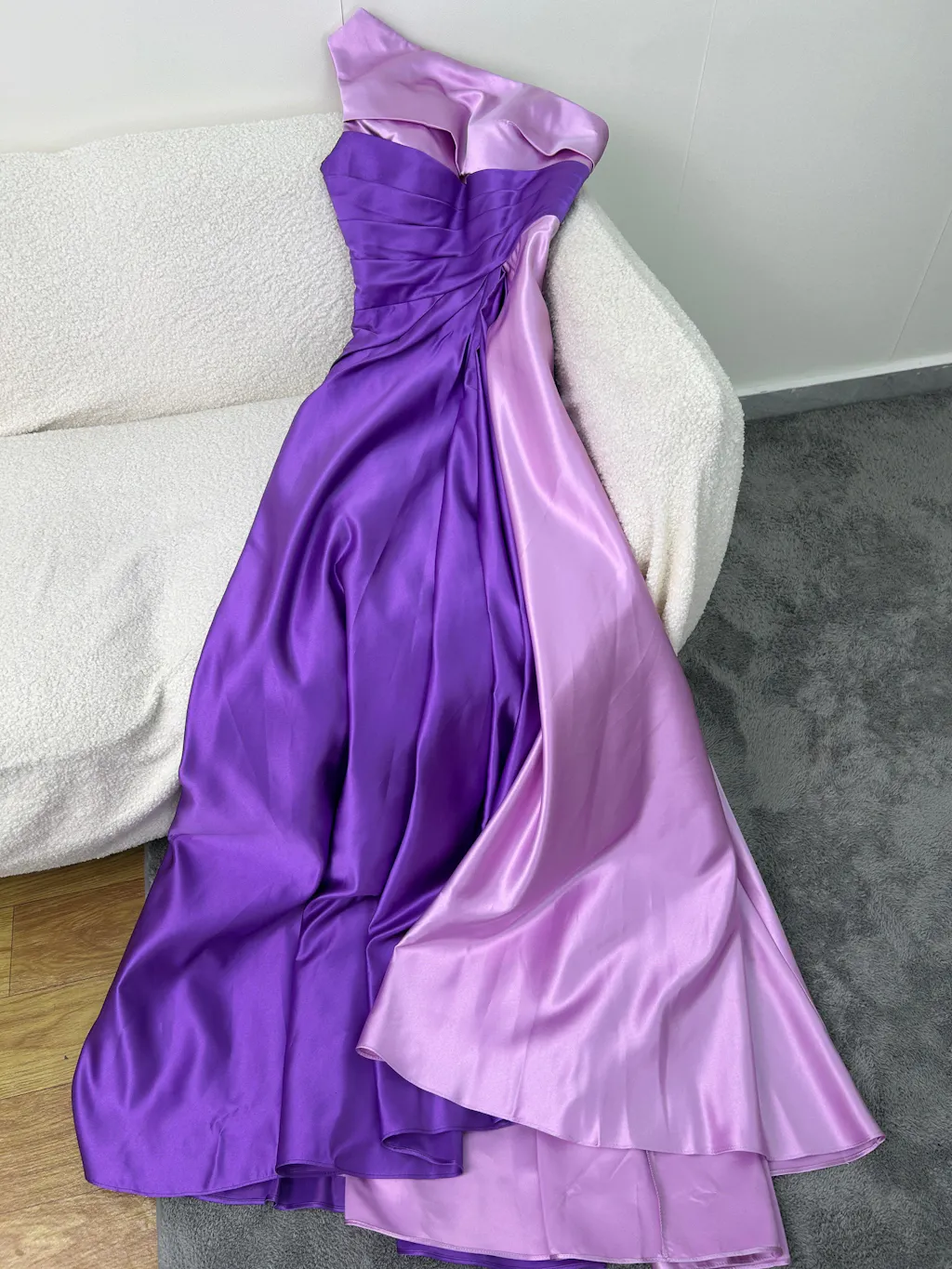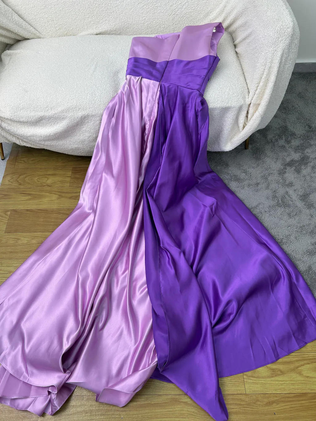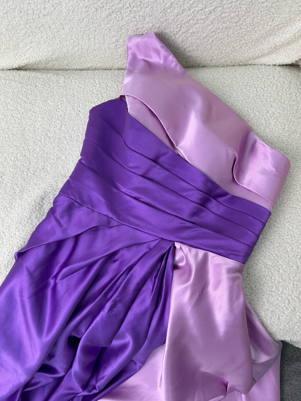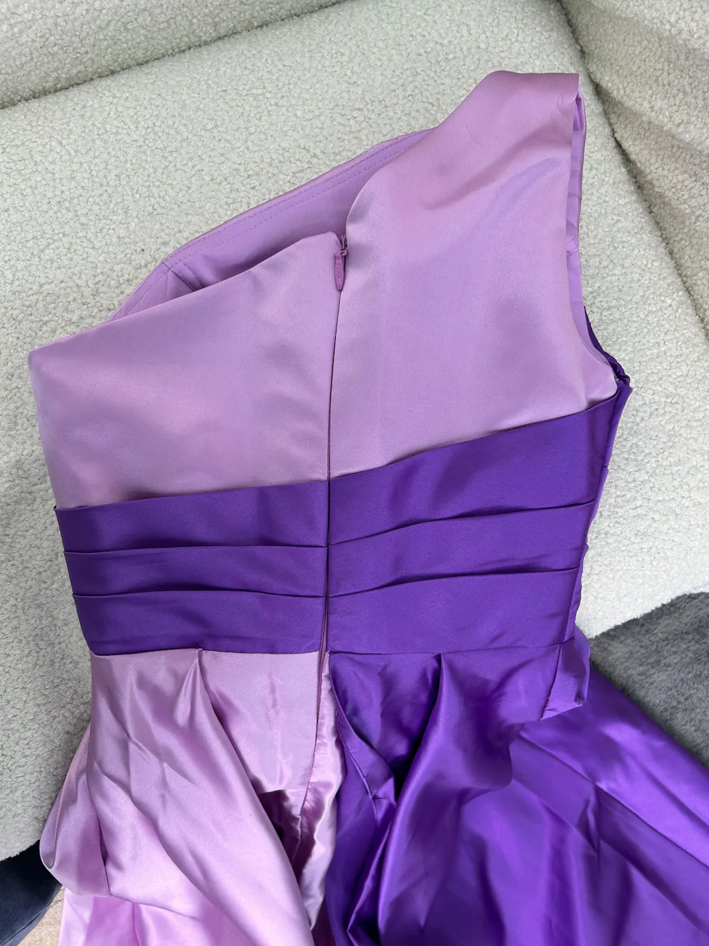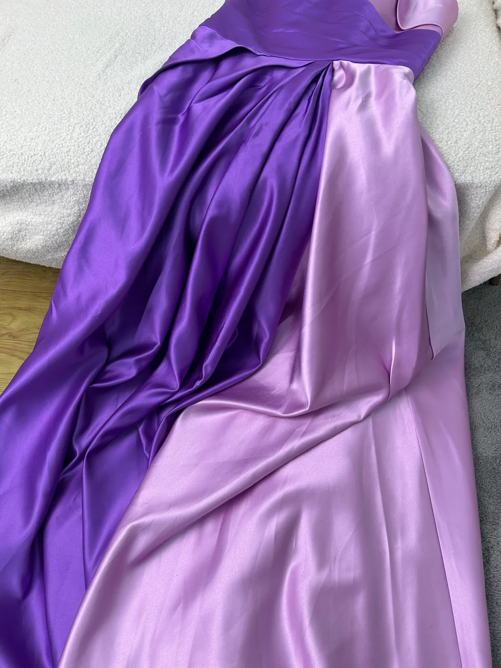 Ordered a dress in size 4, the quality is very good. The purple and lilac design looks fantastic. It's made of a heavy satin fabric, and it drapes beautifully. We had to have the length shortened and the bodice taken in. All in all, it's perfect for the school ball!