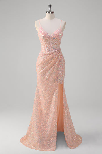 Sparkly Blush Mermaid Corset Sequined Prom Dress with Slit