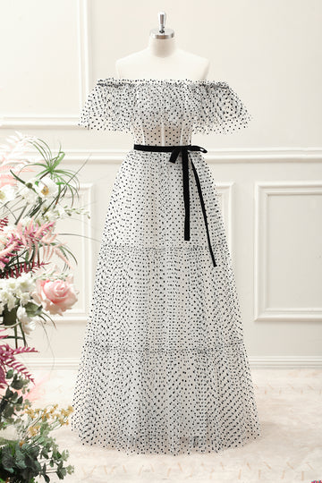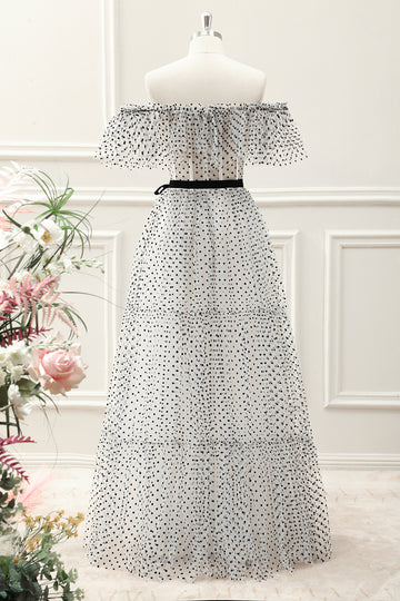White Black Dot Corset Off the Shoulder A Line Maxi Dress