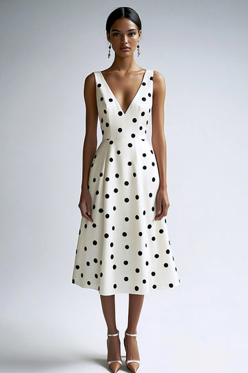 White Black Polka Dot Graduation Dress with Short Sleeves