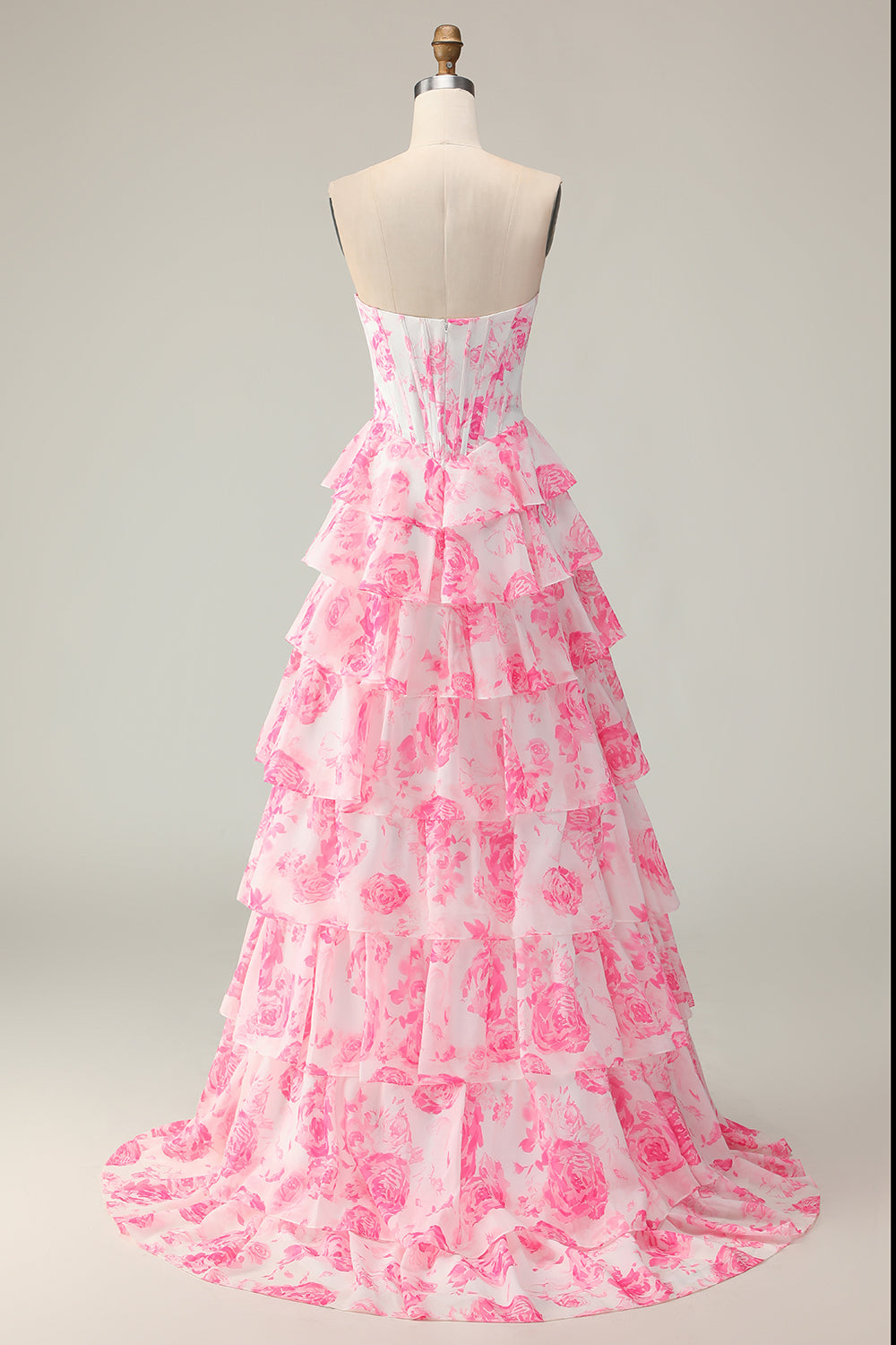 White Pink Flower Tiered A-Line Corset Sweetheart Prom Dress With Slit