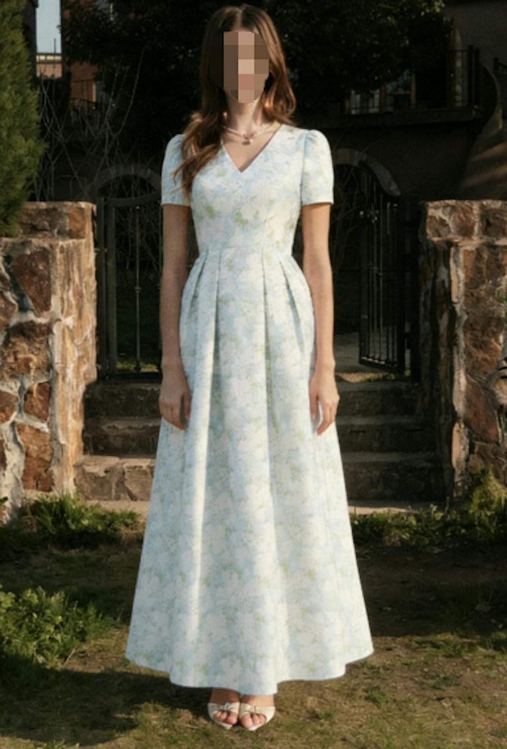 Blue White Floral A Line V Neck Midi Wedding Guest Dress