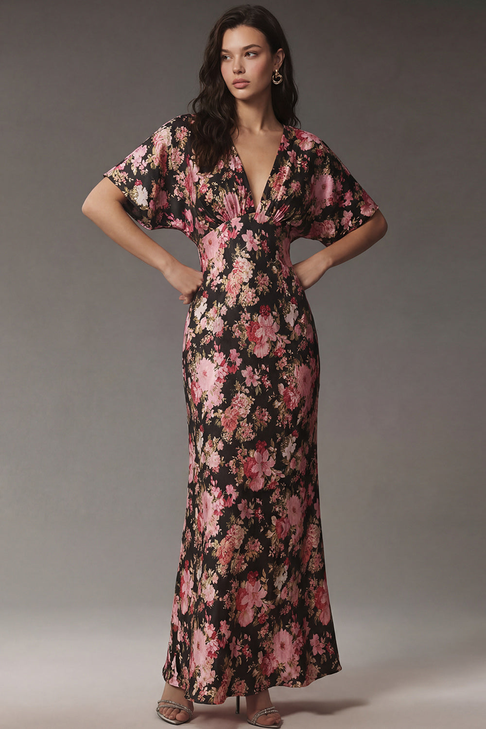 Pink Floral Flutter Sleeve V Neck Wedding Guest Dress