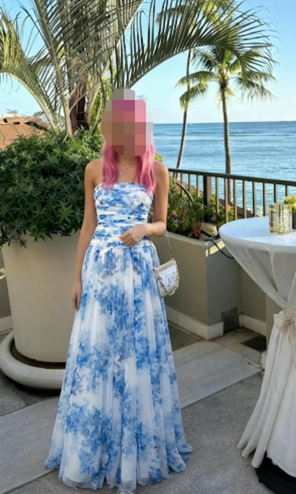 Strapless White Blue Floral A Line Maxi Wedding Guest Dress