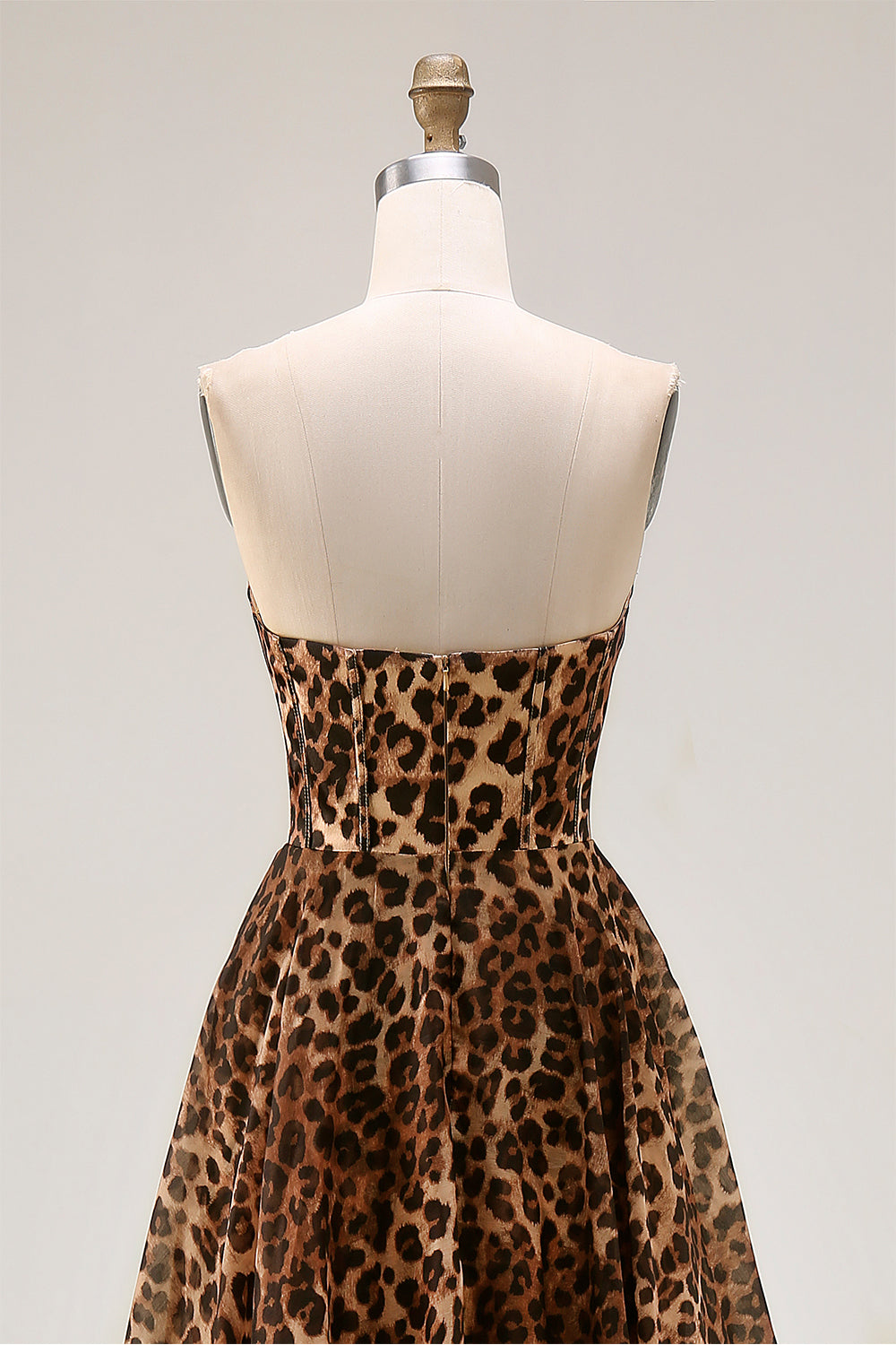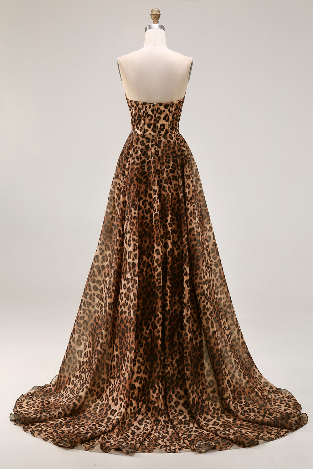 Strapless Brown Leopard A-Line Corset Prom Dress With Slit