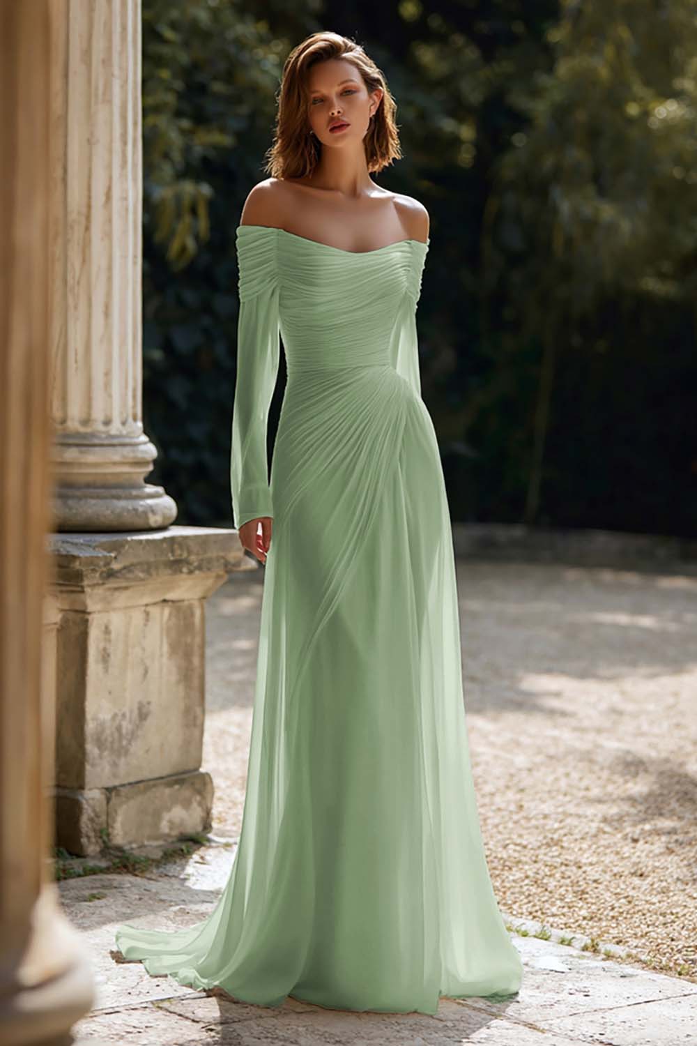 Ivory Ruched Long Sleeve Off The Shoulder Engagement Dress
