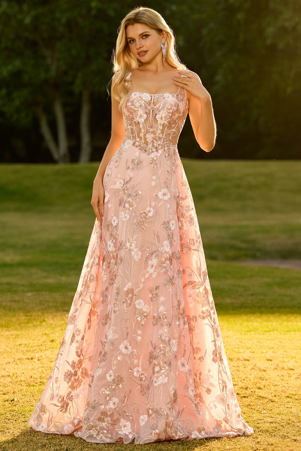 Pink Floral A-Line Corset Appliqued Maxi Prom Dress