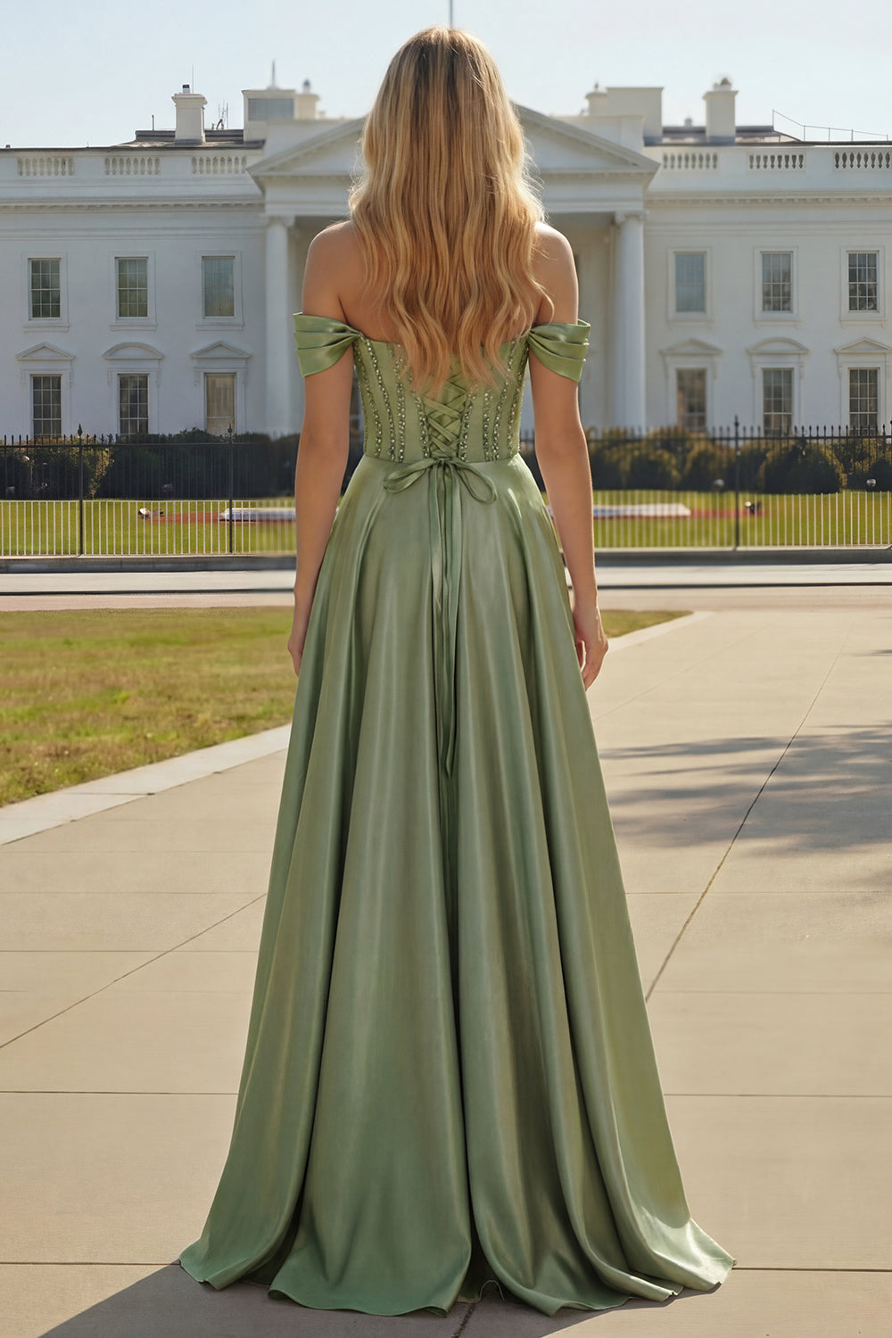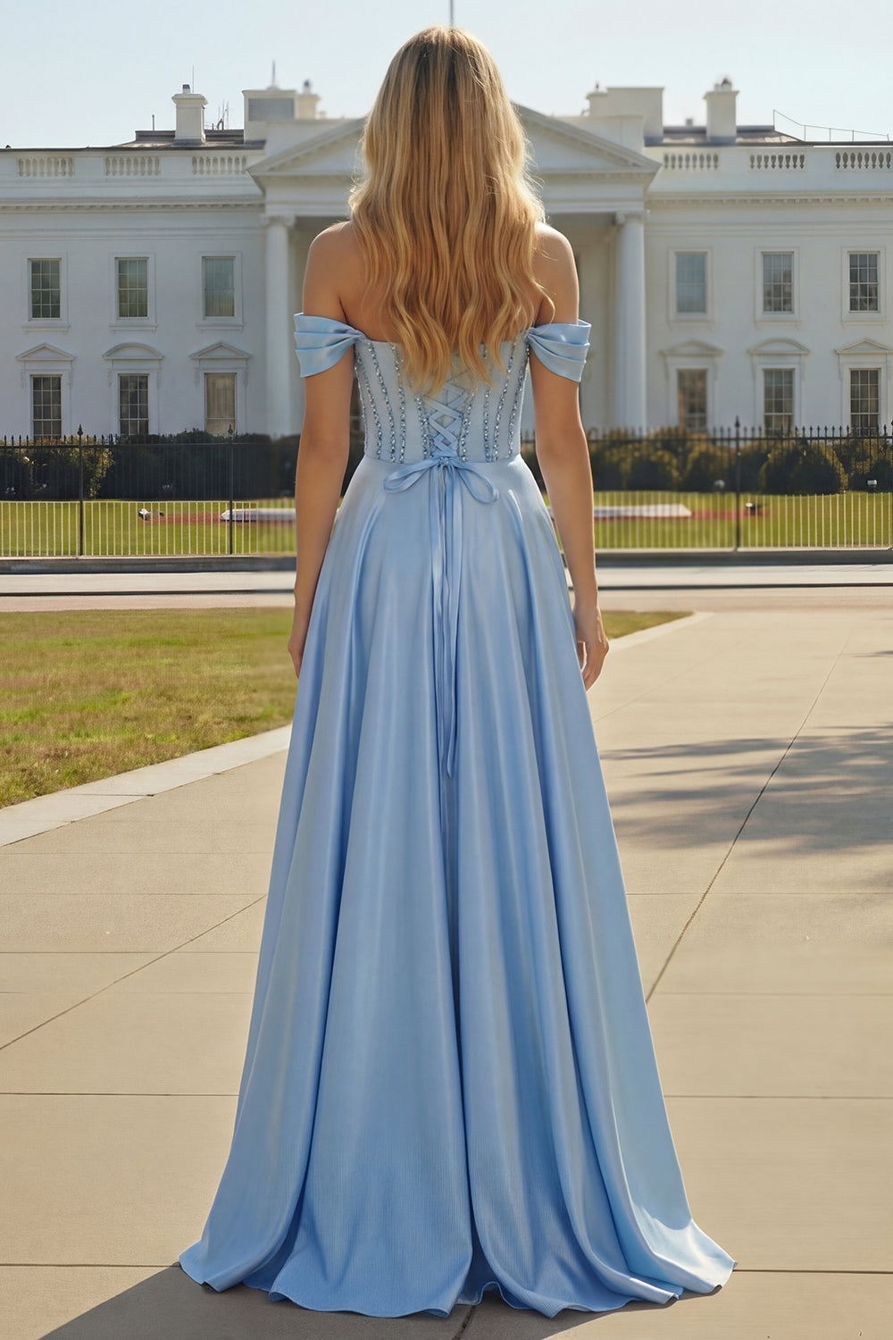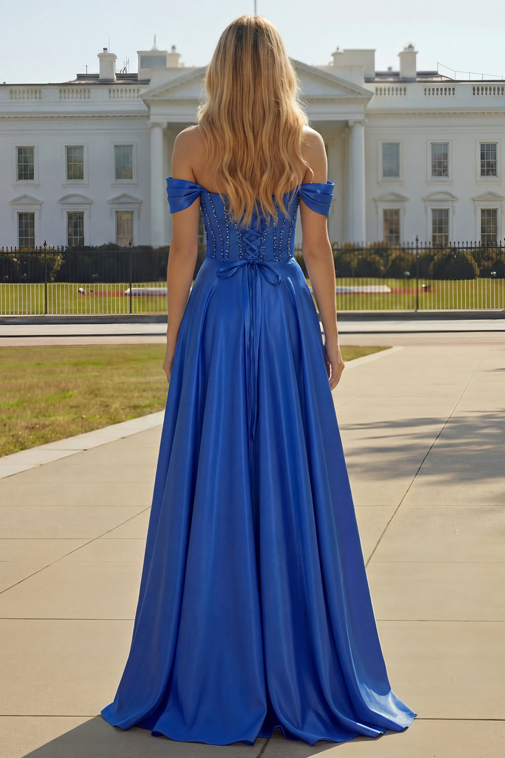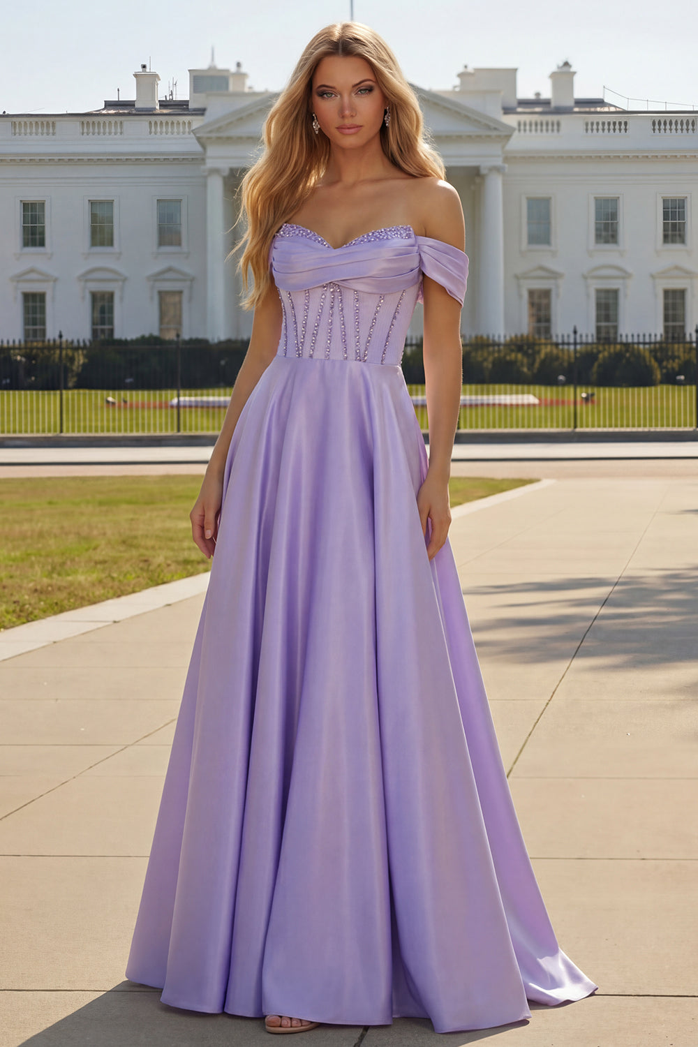 Purple Off The Shoulder A Line Beaded Satin Prom Dress