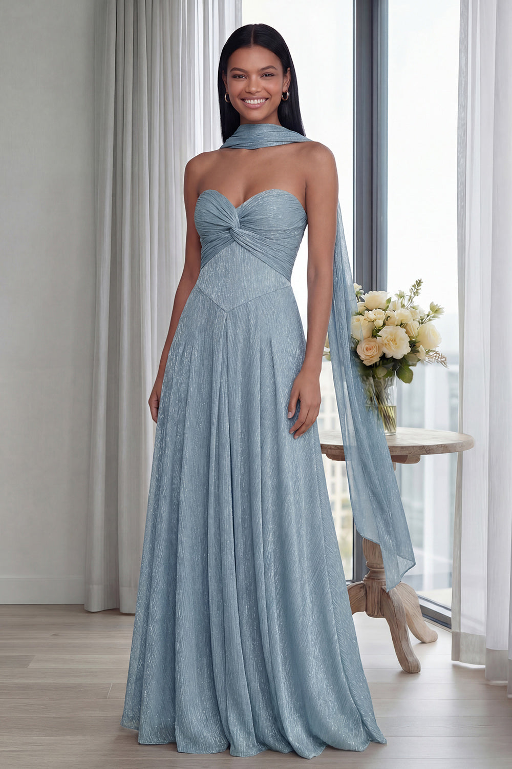Strapless Sky Blue Ruched A Line Formal Dress